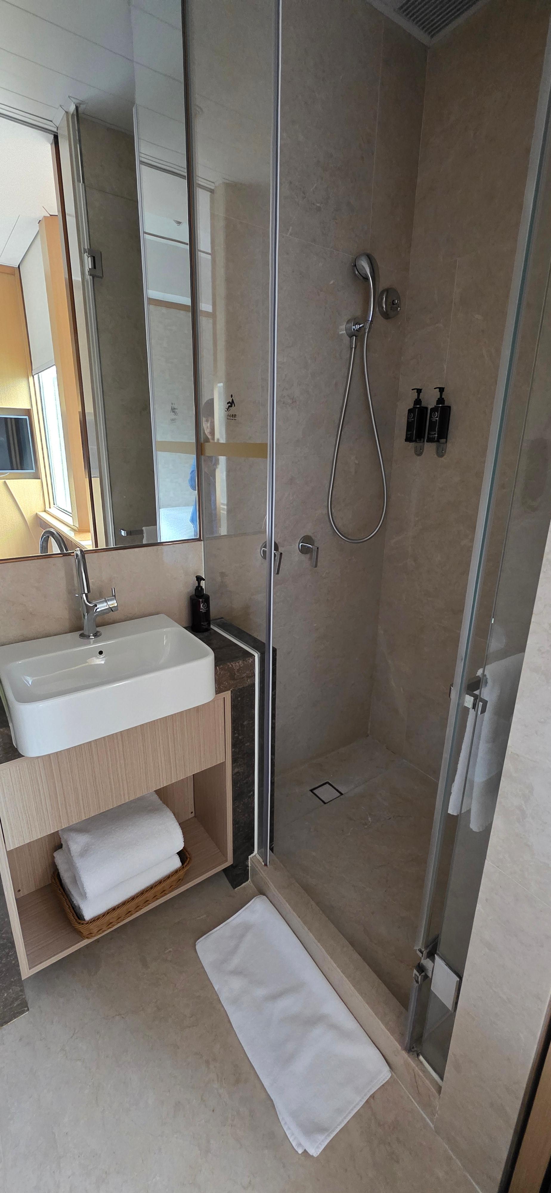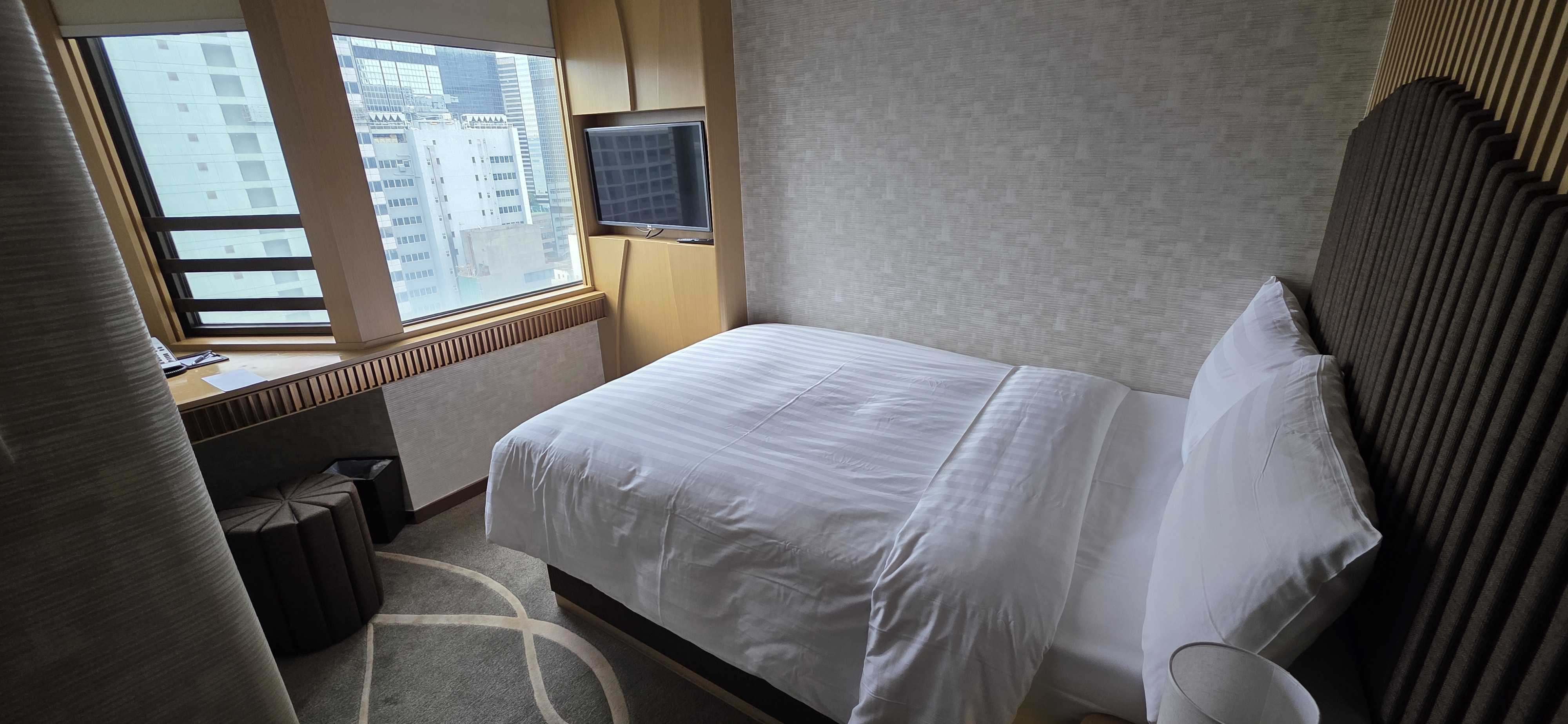 높은 층으로 해달라고 해서 25층으로 주긴 했는데 사실 뷰도 마땅치 않고 침대 바로 밑에 공간에 캐리어 하나 열어두면 끝인 매우 협소한 공간이었습니다. 아래 사진에서 보이는 공간이 사실 다입니다.